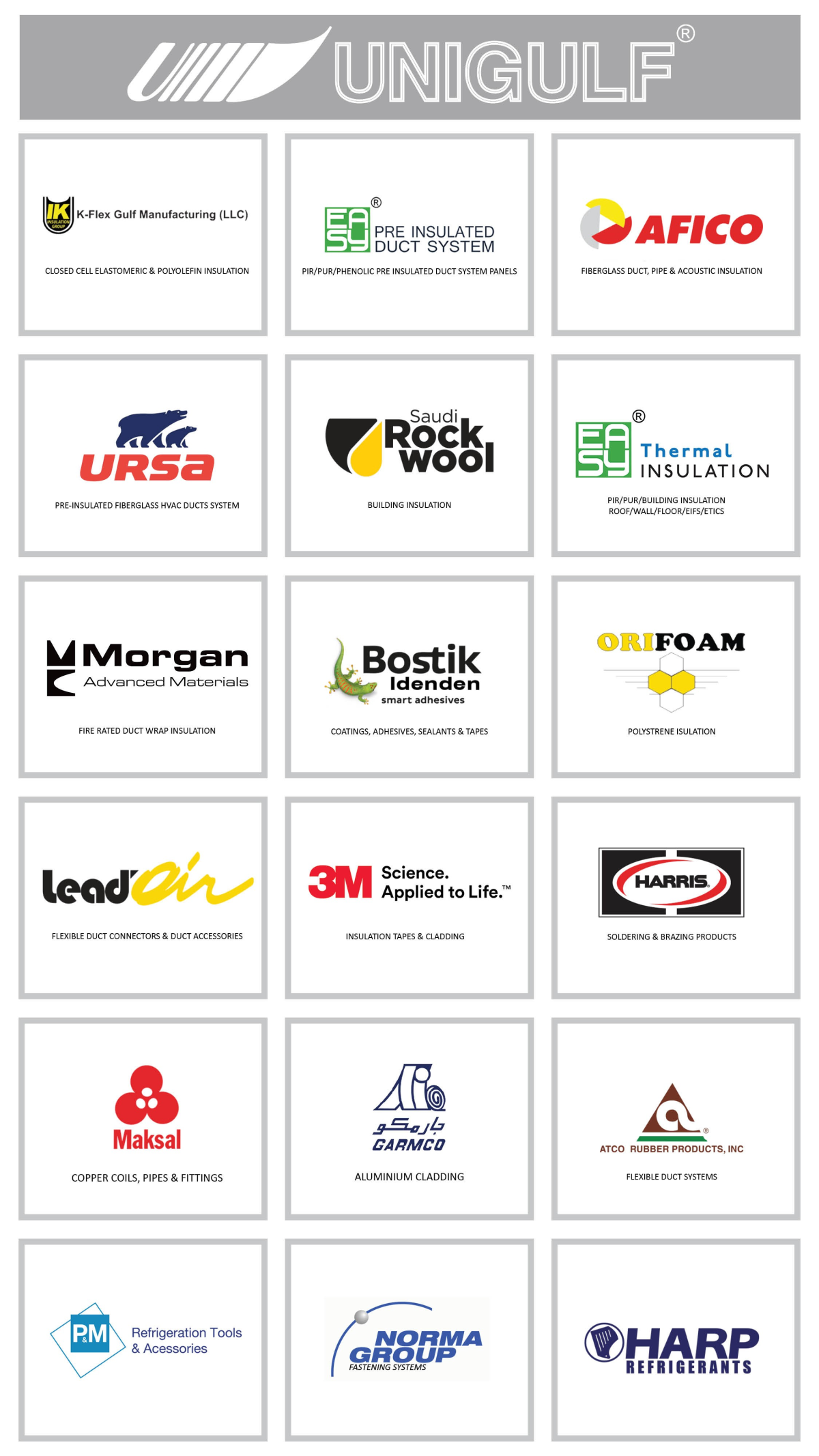 UNIGULF Development LLC was established in 1986 to cater to the needs of MEP contractors. Since then the company has come a long way and has become one of the most trusted suppliers of various types of products and accessories to contractors in the UAE and MENA region. The range of products comprises elastomeric foam insulation, fiberglass, rockwool, polyolefin, extruded/expanded polystyrene, ducting accessories, cladding systems, coatings/ adhesives/sealants, refrigerants, and range of refrigeration tools/accessories.