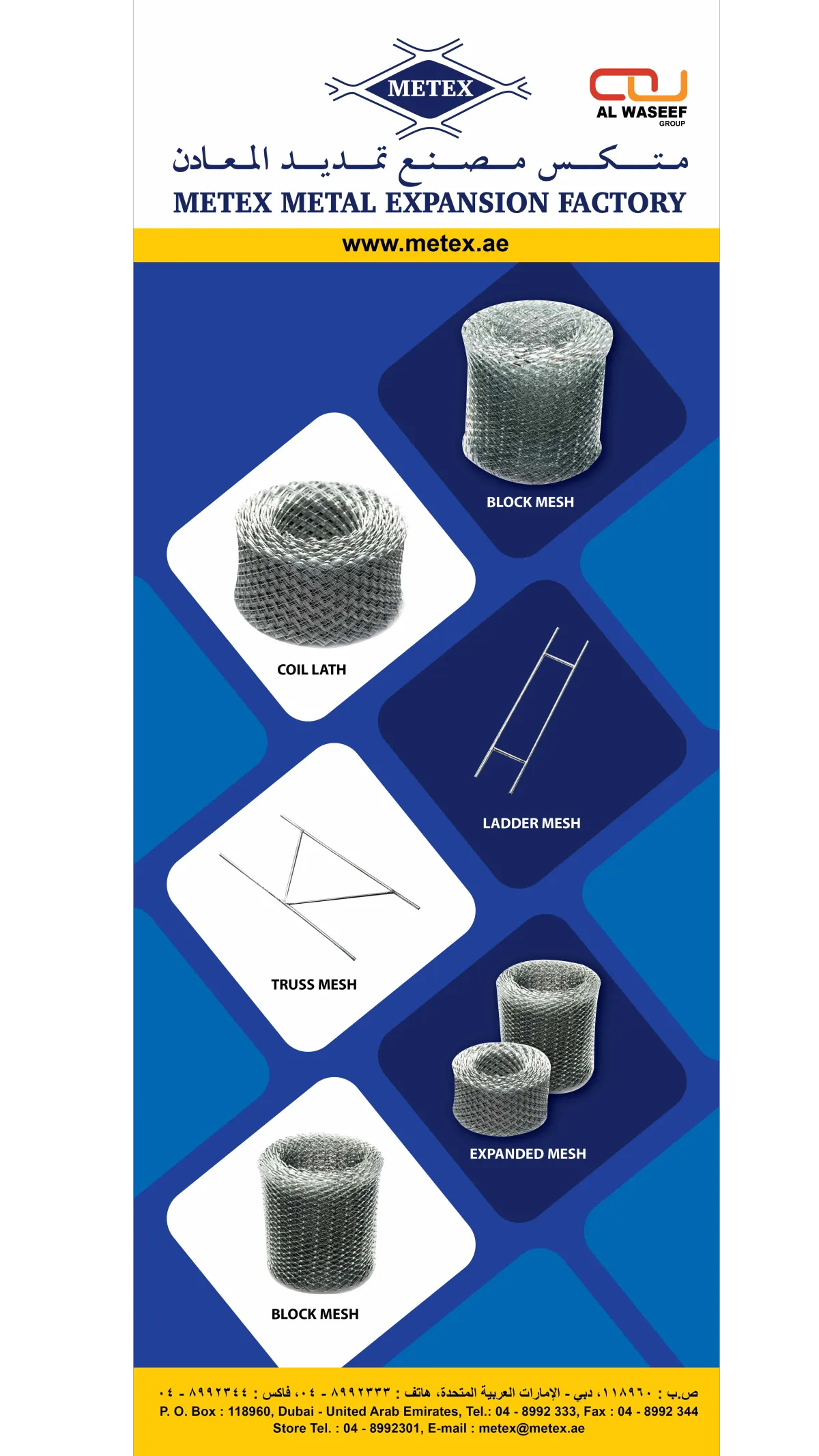 Metex Metal Expansion Factory, (is an ISO certified – ISO 9001:2015), is engaged in manufacturing of products for construction industry like expanded metals, reinforcement items, suspension systems, drywall partitions and ceiling systems since 1997. Metex products are made as per British Standards and they are well known in the UAE and MENA markets for superior quality. Metex Quality Management System(QMS) have been certified by world renowned institutions like DAR, TUV, BM TRADA, UKAS etc.